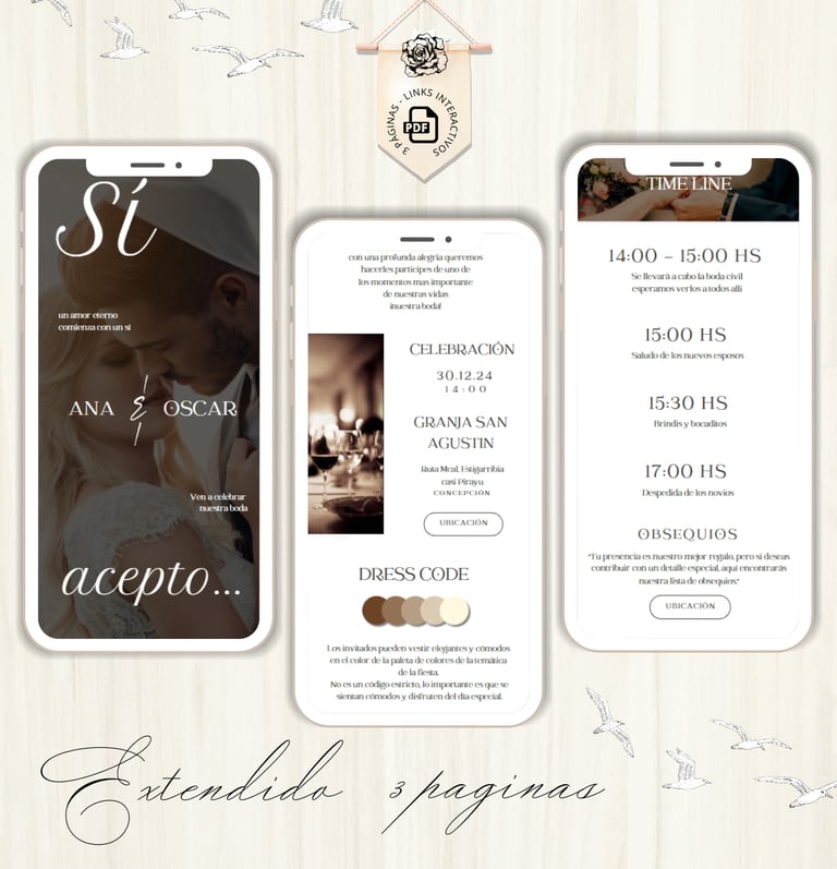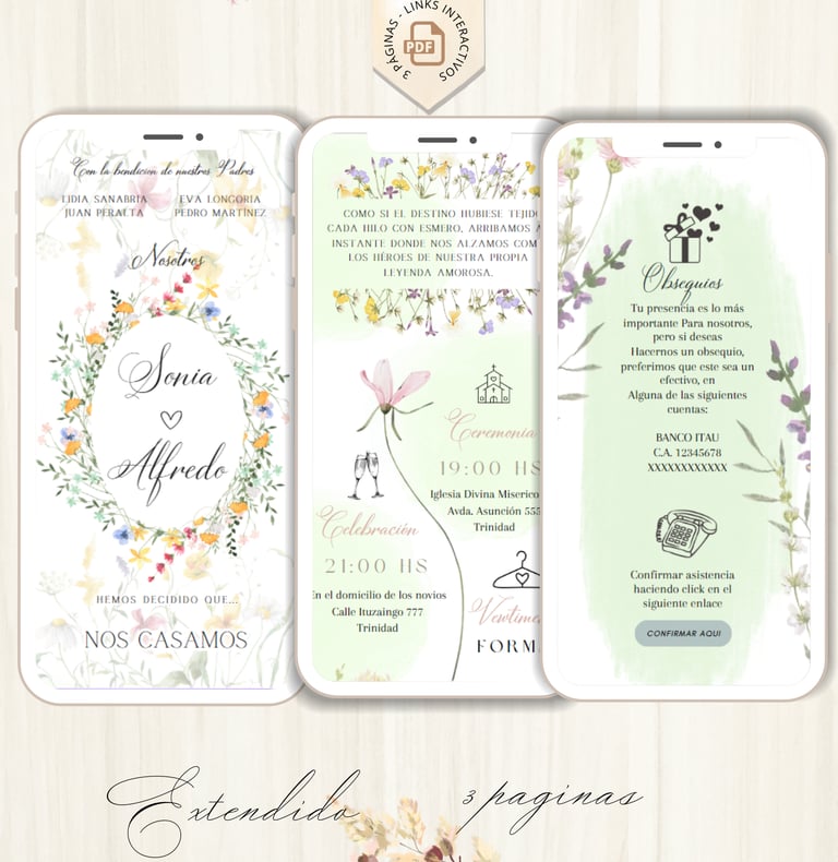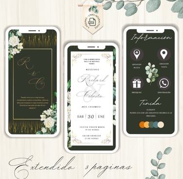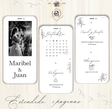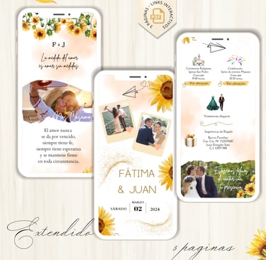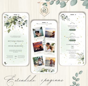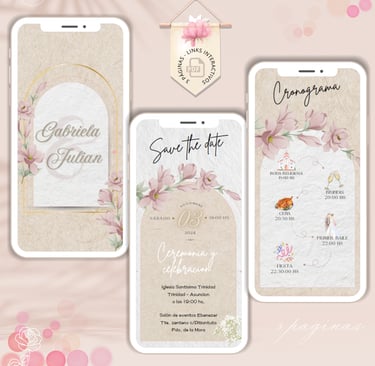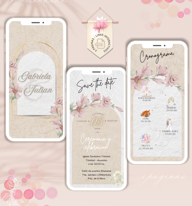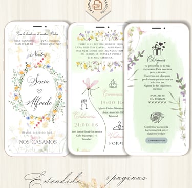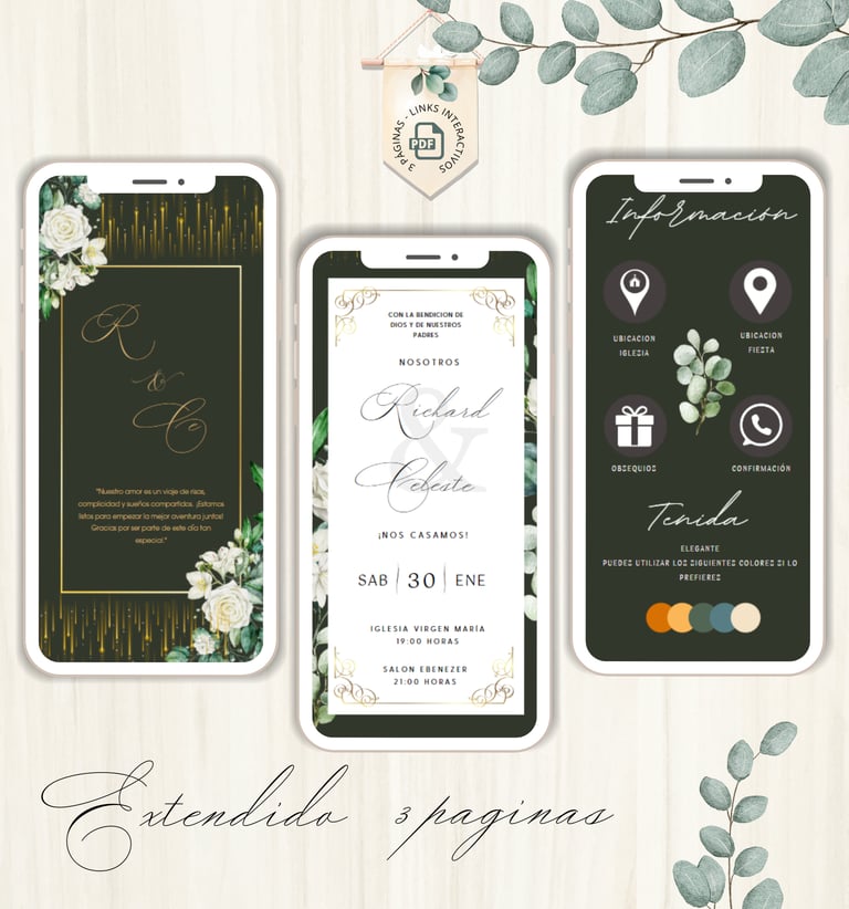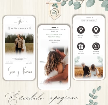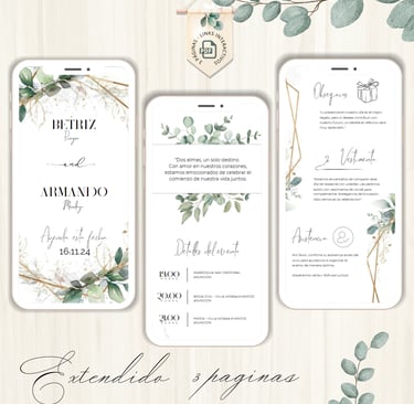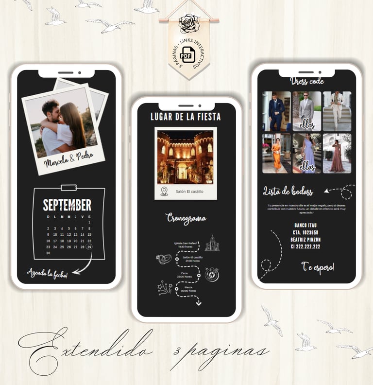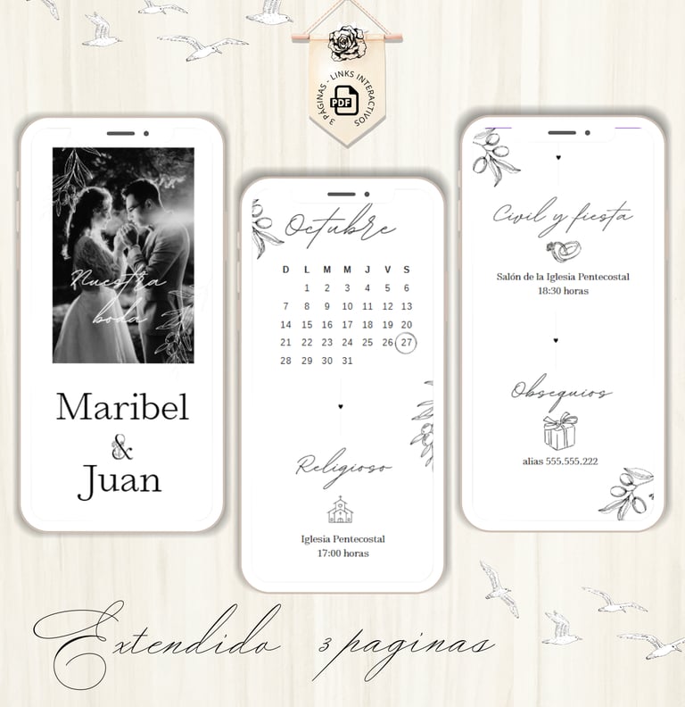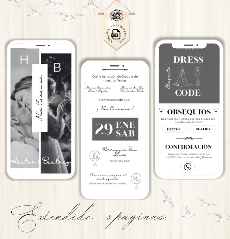 La invitación se envía como un archivo PDF, consta de 3 páginas, con diseños mas elaborados, función de links interactivos aubicación a google maps y confirmación de asistencia por whatsapp, links a lista de obsequios y más!