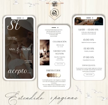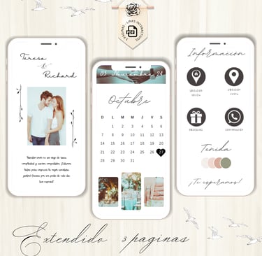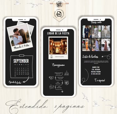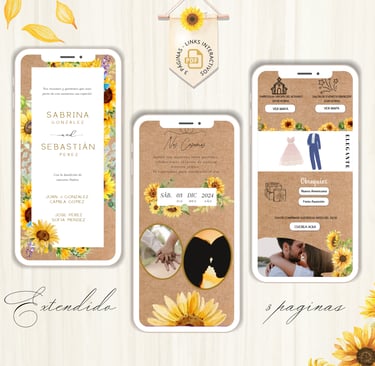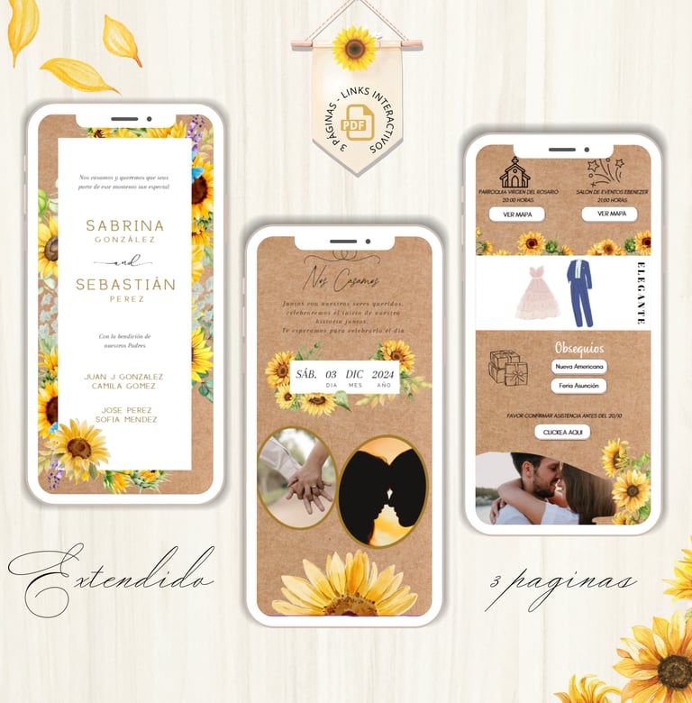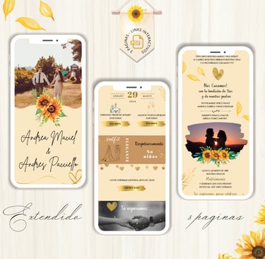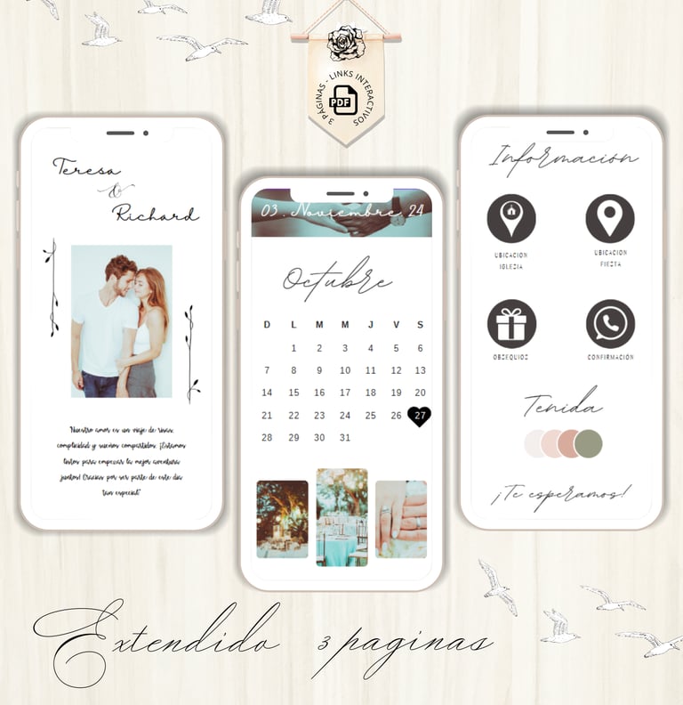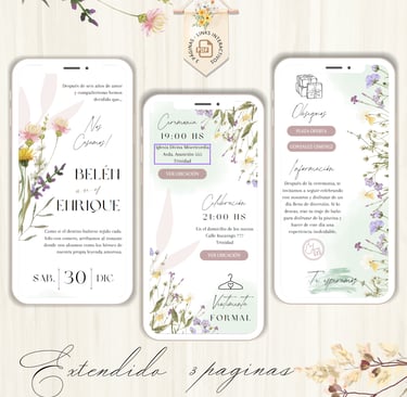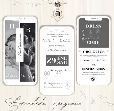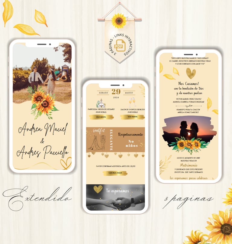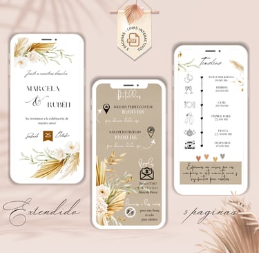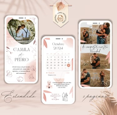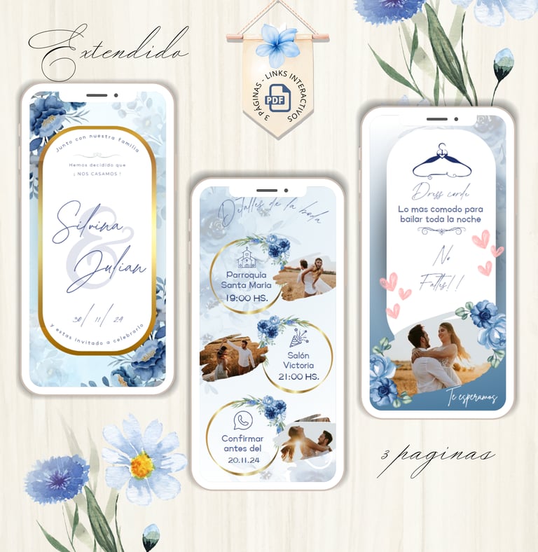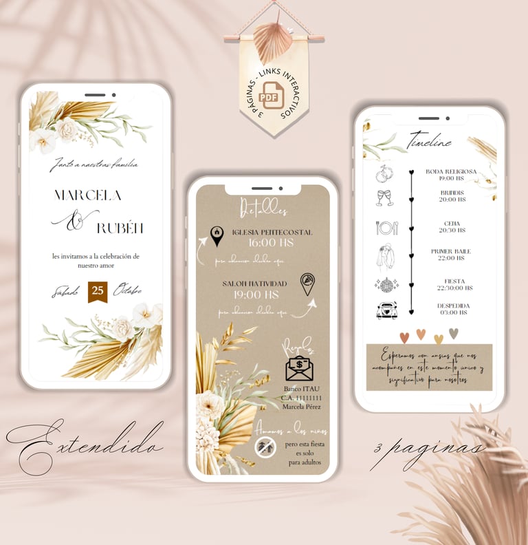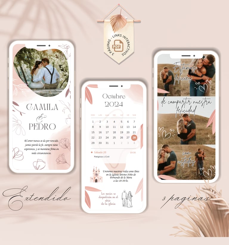 La invitación se envía como un archivo PDF, consta de 3 páginas, con diseños mas elaborados, función de links interactivos aubicación a google maps y confirmación de asistencia por whatsapp, links a lista de obsequios y más!