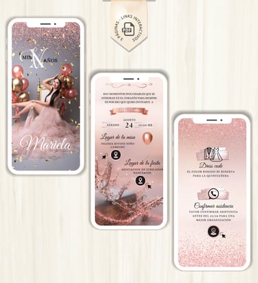 La invitación se envía como un archivo PDF, consta de 3 páginas, con diseños mas elaborados, función de links interactivos ubicación a google maps y confirmación de asistencia por WhatsApp, links a lista de obsequios y más!