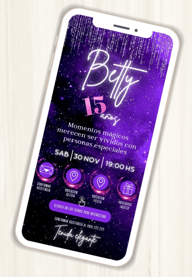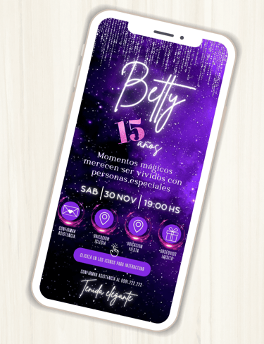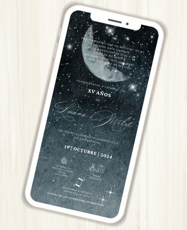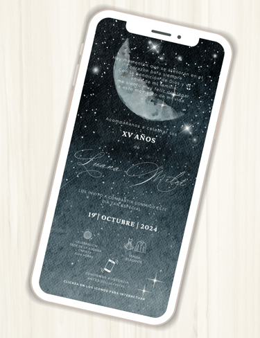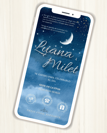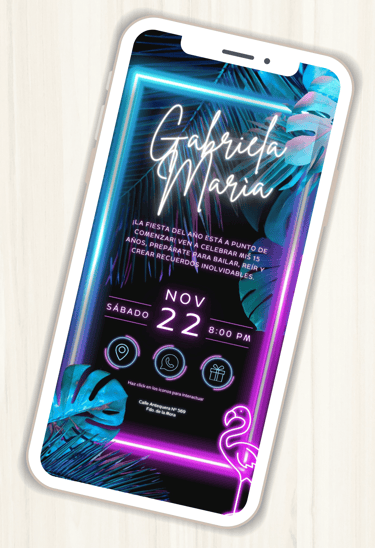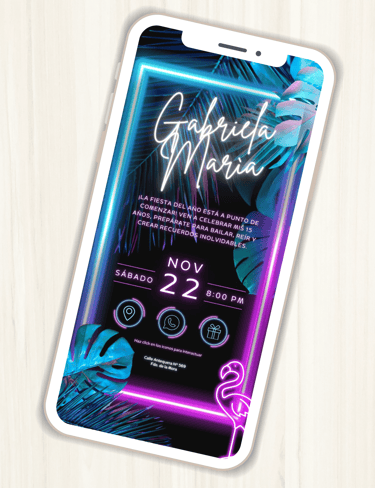 La invitación se envía como un archivo PDF, consta de 3 páginas, con diseños mas elaborados, función de links interactivos ubicación a google maps y confirmación de asistencia por WhatsApp, links a lista de obsequios y más!